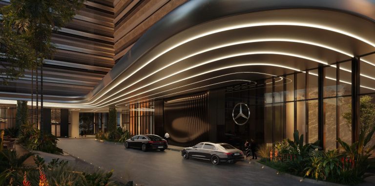 Ein architektonisches Meisterwerk, das die ikonische Designphilosophie von Mercedes-Benz in den urbanen Raum überträgt. Mit klaren Linien, eleganten Konturen und technischer Präzision entsteht ein Ambiente, das ebenso futuristisch wie einladend ist.
