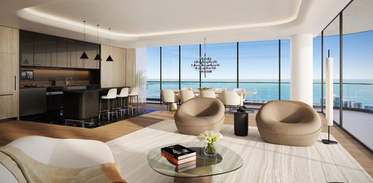 Die großzügige Great-Room-Gestaltung eröffnet einen spektakulären 180-Grad-Blick auf die Biscayne Bay. Organische Möbel, warme Materialien und fließende Linien schaffen ein Ambiente, das modern, elegant und zugleich wohnlich wirkt. Eine nahtlos integrierte Küche, lichtdurchflutete Wohnbereiche und ein Essbereich mit Meerblick machen diesen Raum zum Inbegriff luxuriösen Wohnens.