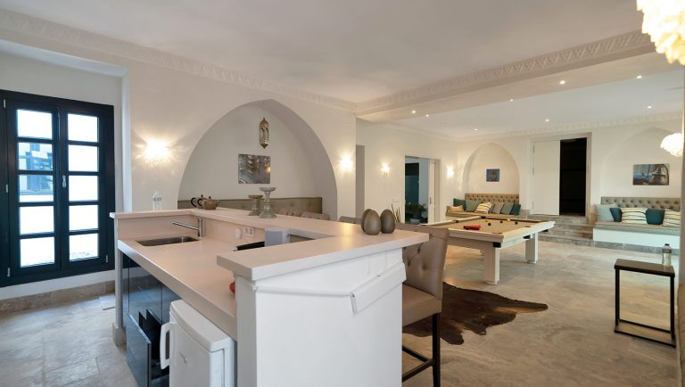 Die Außenbereiche sind auf ein mediterranes Lebensgefühl ausgelegt. Mehrere Terrassen schaffen unterschiedliche Rückzugs- und Begegnungsorte, während ein eleganter Grillbereich mit Pavillon den idealen Rahmen für stilvolle Abende unter freiem Himmel bietet. Der Infinity-Pool scheint nahtlos in die Landschaft überzugehen und verbindet Architektur und Natur zu einem eindrucksvollen Gesamtbild.
