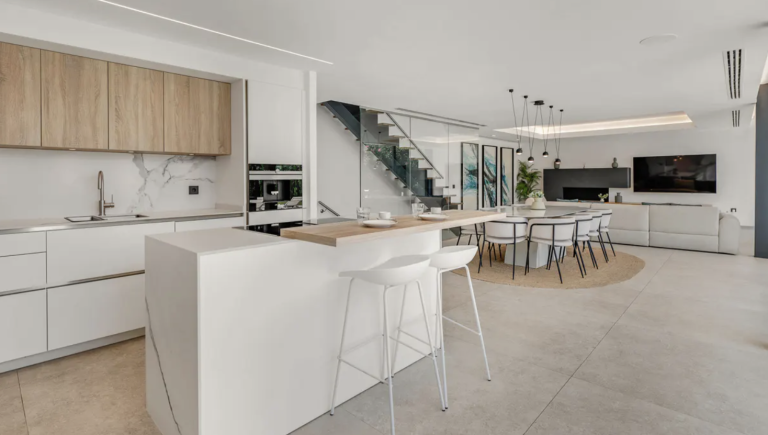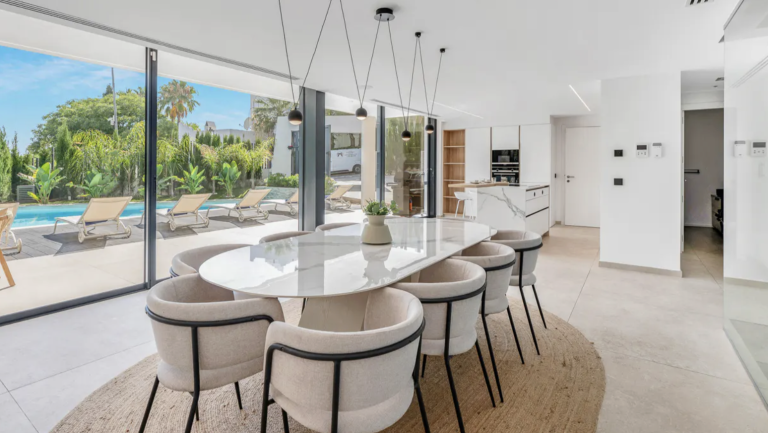 Die Hauptebene präsentiert sich als großzügiger, offen gestalteter Wohnbereich, der modernes Design mit funktionaler Eleganz verbindet. Eine hochwertige, voll ausgestattete Designer-Küche, der stilvolle Essbereich und das lichtdurchflutete Wohnzimmer gehen harmonisch ineinander über und schaffen ein Ambiente von zeitloser Raffinesse. Bodentiefe Glasschiebetüren öffnen sich zur überdachten Terrasse und verbinden den Innenraum nahtlos mit dem sorgfältig angelegten Garten und dem beeindruckenden privaten Pool – ein perfektes Beispiel für den exklusiven Indoor-Outdoor-Lifestyle, der Luxusimmobilien in Marbella weltweit so begehrt macht. Auf dieser Ebene befinden sich zudem ein elegantes Gäste-WC sowie eine private Garage mit direktem Zugang zur Küche für höchsten Komfort im Alltag.