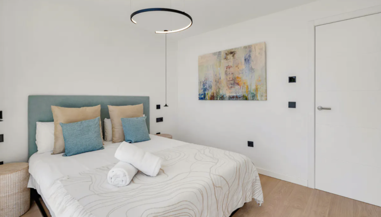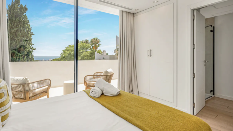 Im Obergeschoss befinden sich drei großzügige Schlafzimmer-Suiten, die jeweils über ein eigenes Bad verfügen und direkten Zugang zu einer weitläufigen Panoramaterrasse bieten. Von hier aus eröffnet sich ein atemberaubender Blick auf das glitzernde Mittelmeer. Die Master-Suite beeindruckt mit einem privaten Ankleidebereich und der wohl spektakulärsten Aussicht des gesamten Hauses. Großzügige Fensterflächen maximieren das natürliche Licht und schaffen gleichzeitig ein Gefühl von Ruhe und Privatsphäre – Eigenschaften, die besonders von internationalen Käufern geschätzt werden.