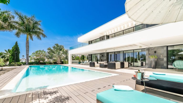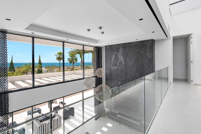 Diese außergewöhnliche, moderne Villa mit sechs Schlafzimmern erstreckt sich über drei Ebenen und befindet sich in privilegierter Lage im renommierten Los Flamingos Golf Resort, einer der gefestigtsten und begehrtesten Wohnadressen in Marbella West. Erhaben über der Küstenlinie gelegen, eröffnet die Immobilie einen unverbaubaren Panoramablick auf das Mittelmeer, eingebettet in eine grüne Landschaft aus erstklassigen Championship-Golfplätzen. Das Anwesen vereint Großzügigkeit, Privatsphäre und nachhaltigen Werterhalt zu einem ausgewogenen, anspruchsvollen Lebenskonzept.