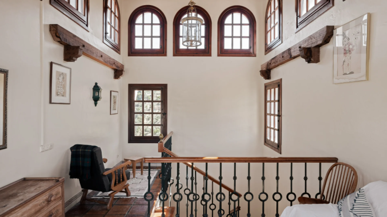 Die Hauptresidenz umfasst sechs großzügige Schlafzimmer, darunter ein charakteristisches Turmzimmer, das sich ideal als privates Büro, Atelier oder zusätzliche Suite eignet. Der offen gestaltete Wohn- und Essbereich wird von eleganten Rundbogenfenstern umrahmt, die den Raum mit natürlichem Licht durchfluten und einen nahtlosen Übergang zur weitläufigen Terrasse mit spektakulärem Panoramablick schaffen.