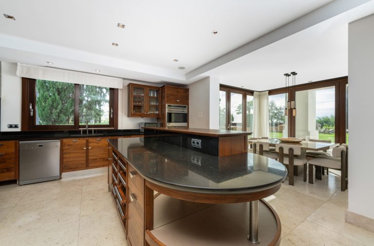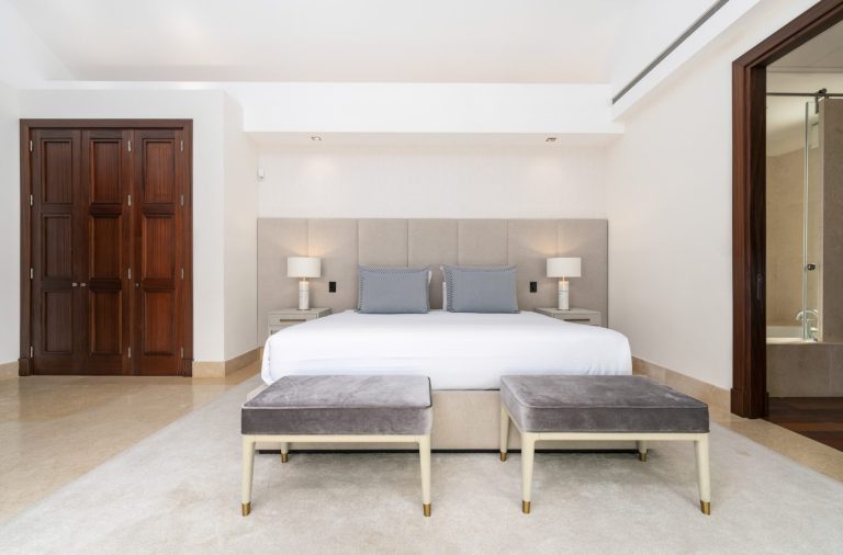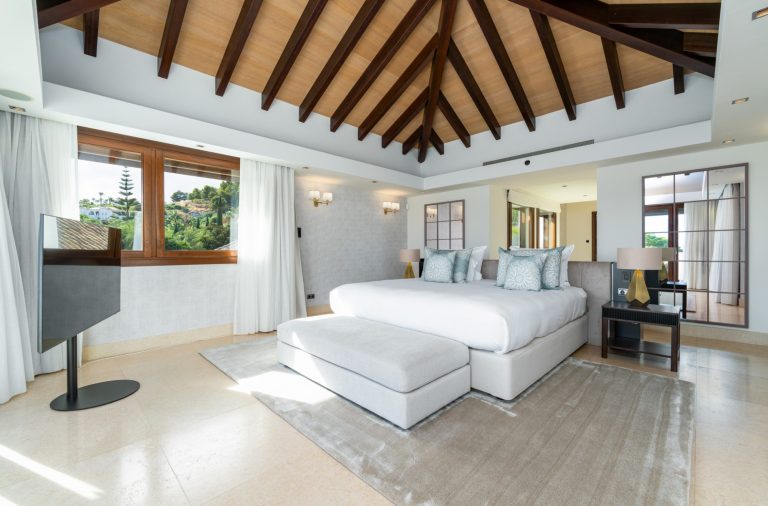 Bereits beim Betreten der Villa empfängt Sie ein elegantes, lichtdurchflutetes Interieur mit hochwertigen Materialien und modernem Design. Die Immobilie verfügt über sechs großzügige Schlafzimmer, jedes mit eigenem Bad en Suite. Die Master-Suite ist ein privates Refugium mit weitläufigem Badezimmer, zwei separaten Bereichen und einer eigenen Terrasse mit spektakulärer Aussicht. Eine zusätzliche Gästesuite nahe dem Eingang bietet dank einer eigenen kleinen Küche maximale Privatsphäre – ideal für Besucher oder Personal.